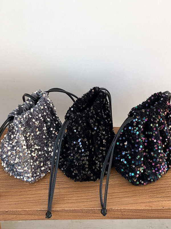 Home / Bag / Handbag / New crossbody bucket bag for women’s pull rope pleated design soft hand-held shoulder bag European and American color sequin bag